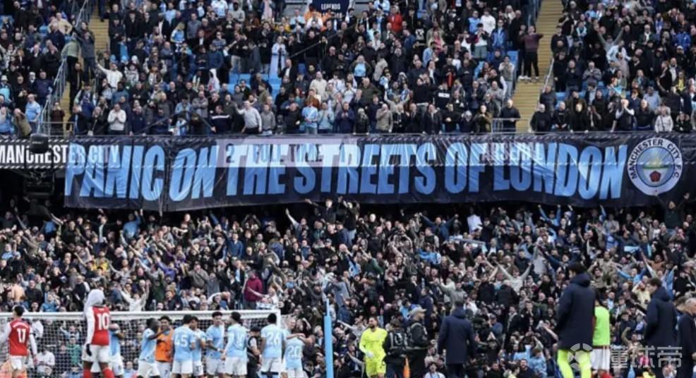 北京时间4月20日,英超第33轮,曼城2-1阿森纳。在阿提哈德球场,曼城球迷拉出了一条横幅,上面写着:“伦敦街头陷入恐慌”。